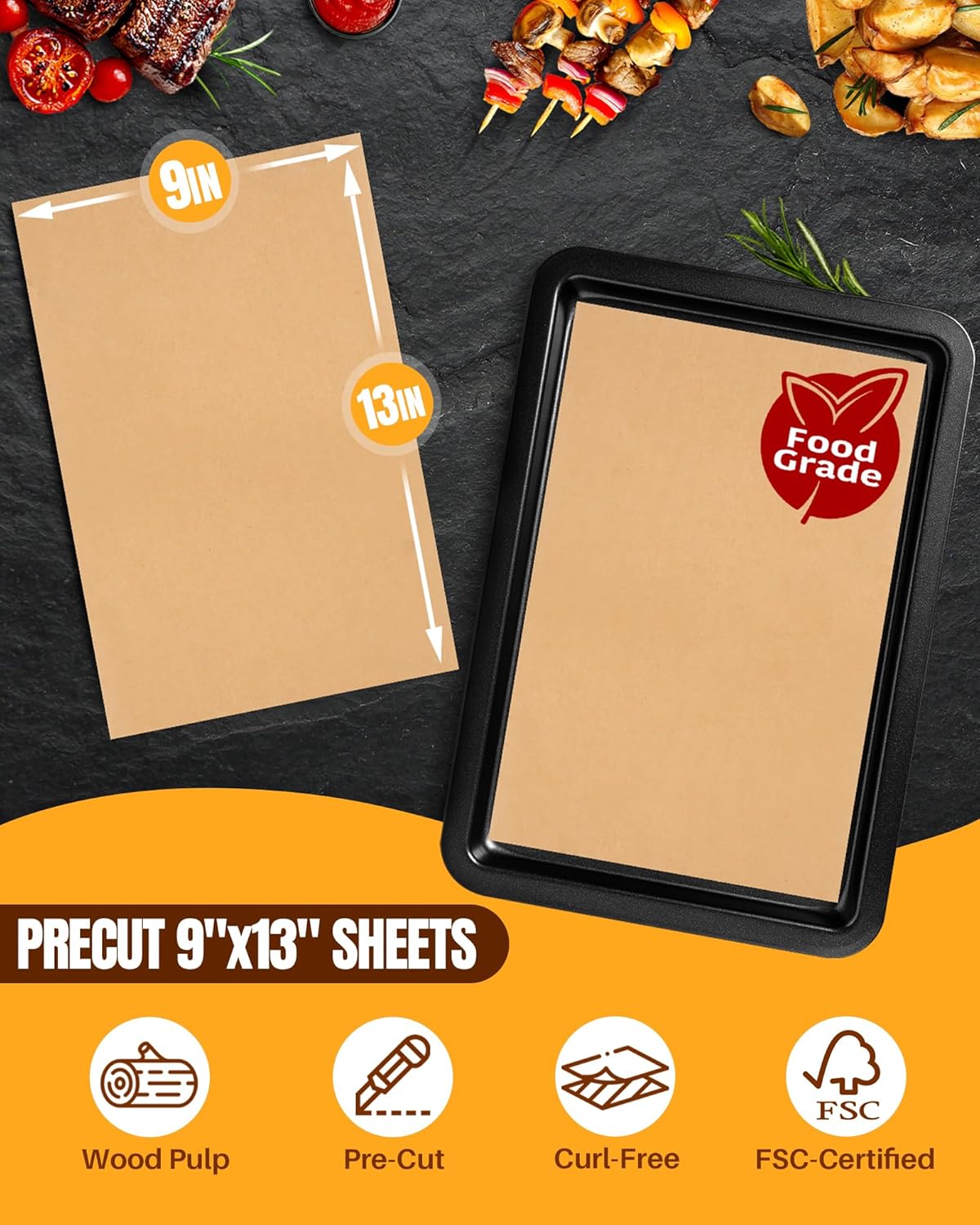 - ✂️【PRECUT 9×13 INCH – NO CUTTING】 Each sheet is precisely pre-cut to 9″ x 13″ (Quarter Sheet size). Perfect fit for standard baking sheets, air fryer baskets, and pans. Saves time – no more measuring or wrestling with curling rolls!