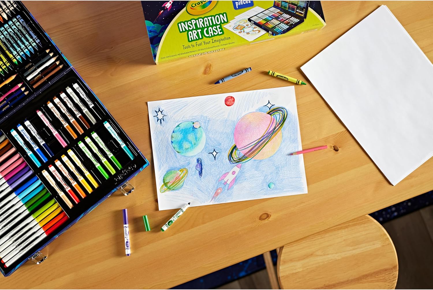 - 140-PIECE ART KIT: Includes 64 Cayons, 40 Washable Markers, 20 Short Colored Pencils, 15 Large Drawing Sheets, and a durable space-themed art case for kids who love to create.