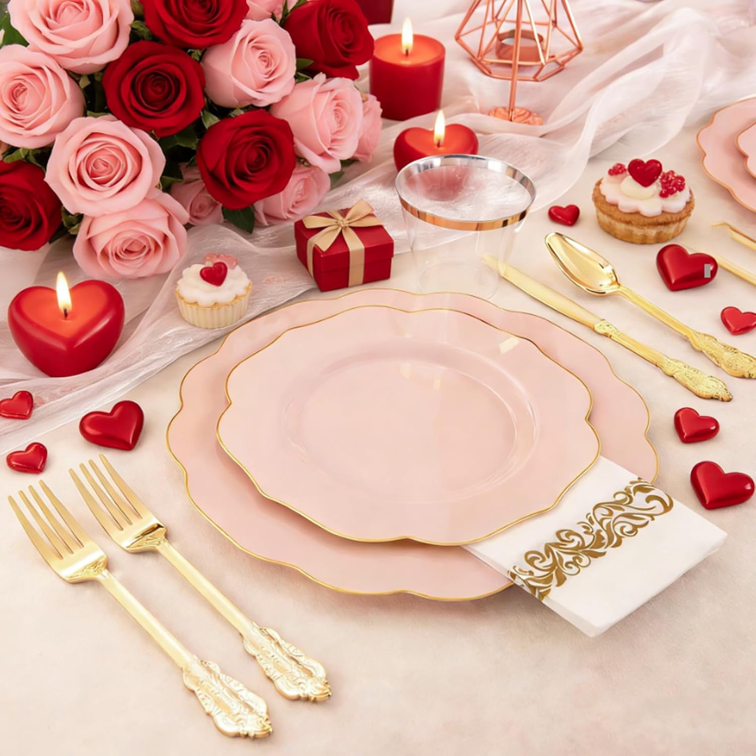 - FLOWER DESIGN: Our pink plastic plates are designed in the shape of flowers. The edges of these pink party plates are plated with a layer of gold. The combination of gold and pink exudes romance, making these plates ideal for decorating a galentines day party.