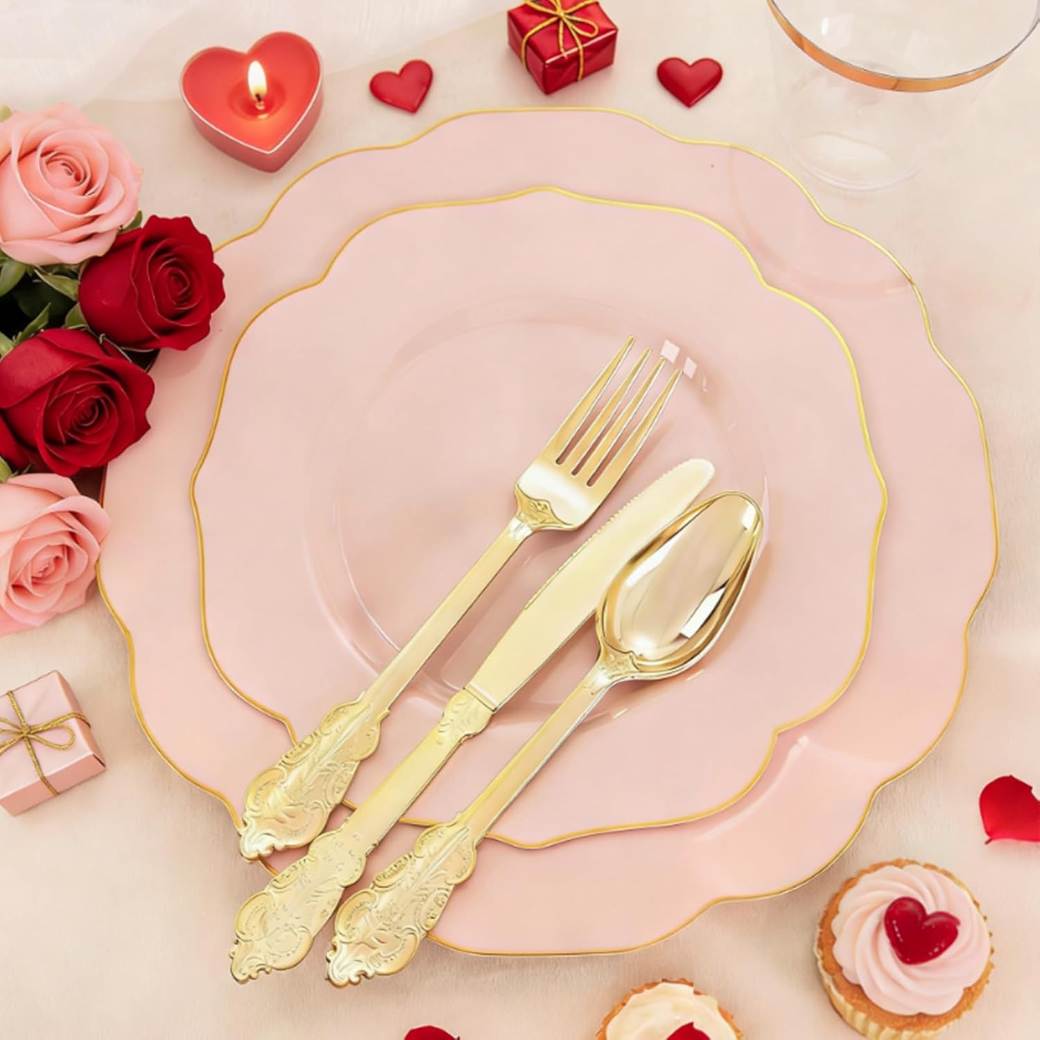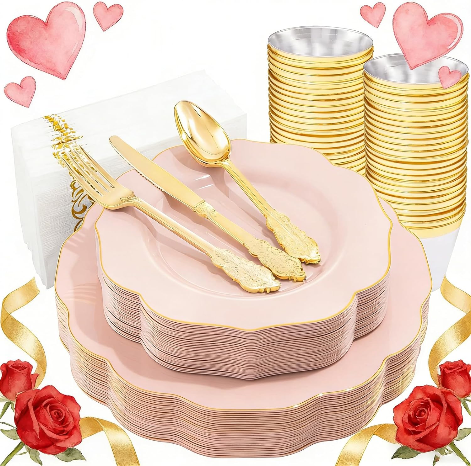 - FULL SET OF TABLEWARE: Our Pink plastic plates and napkins are a complete set of dinnerware. You can get 25 pink dinner plates, 25 pink dessert plates, 25 knives, 25 forks, 25 spoons, 25 cups, 25 napkins. These pink and gold plastic plates will work together to bring you a wonderful party experience.
