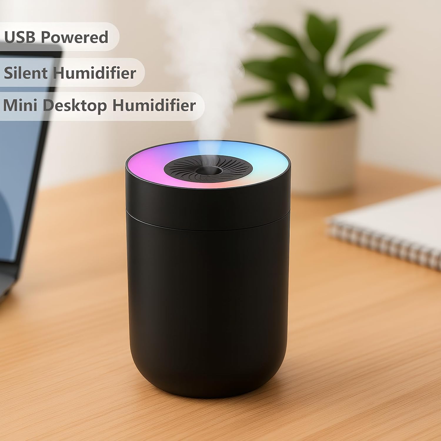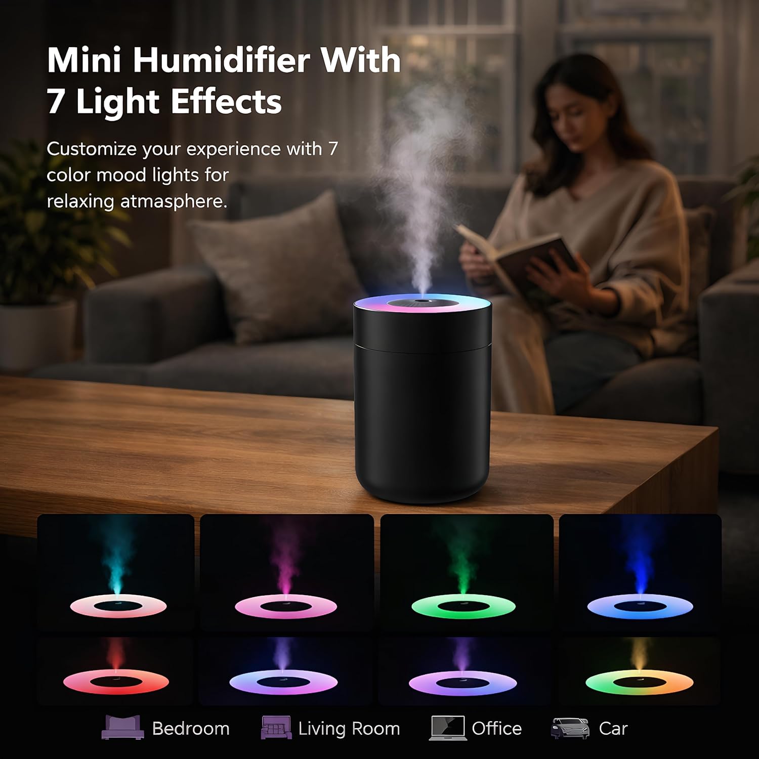 - [Mini Humidifier for Bedroom Color LED Light]:Enhance your mood with vibrant cycling LED lights that create a calming ambiance—perfect for relaxation, sleep, or adding a decorative touch to your space. Switch between colors to match your vibe or use it as a gentle night light.