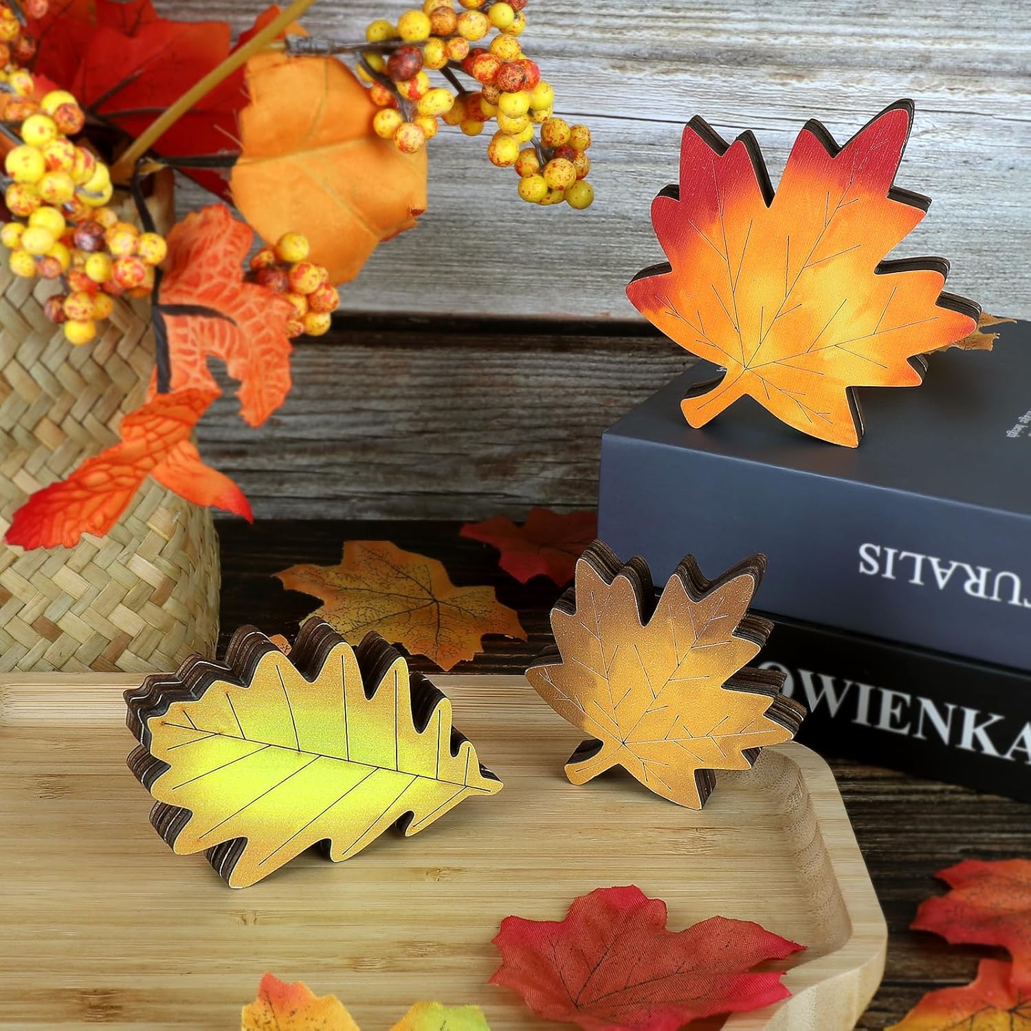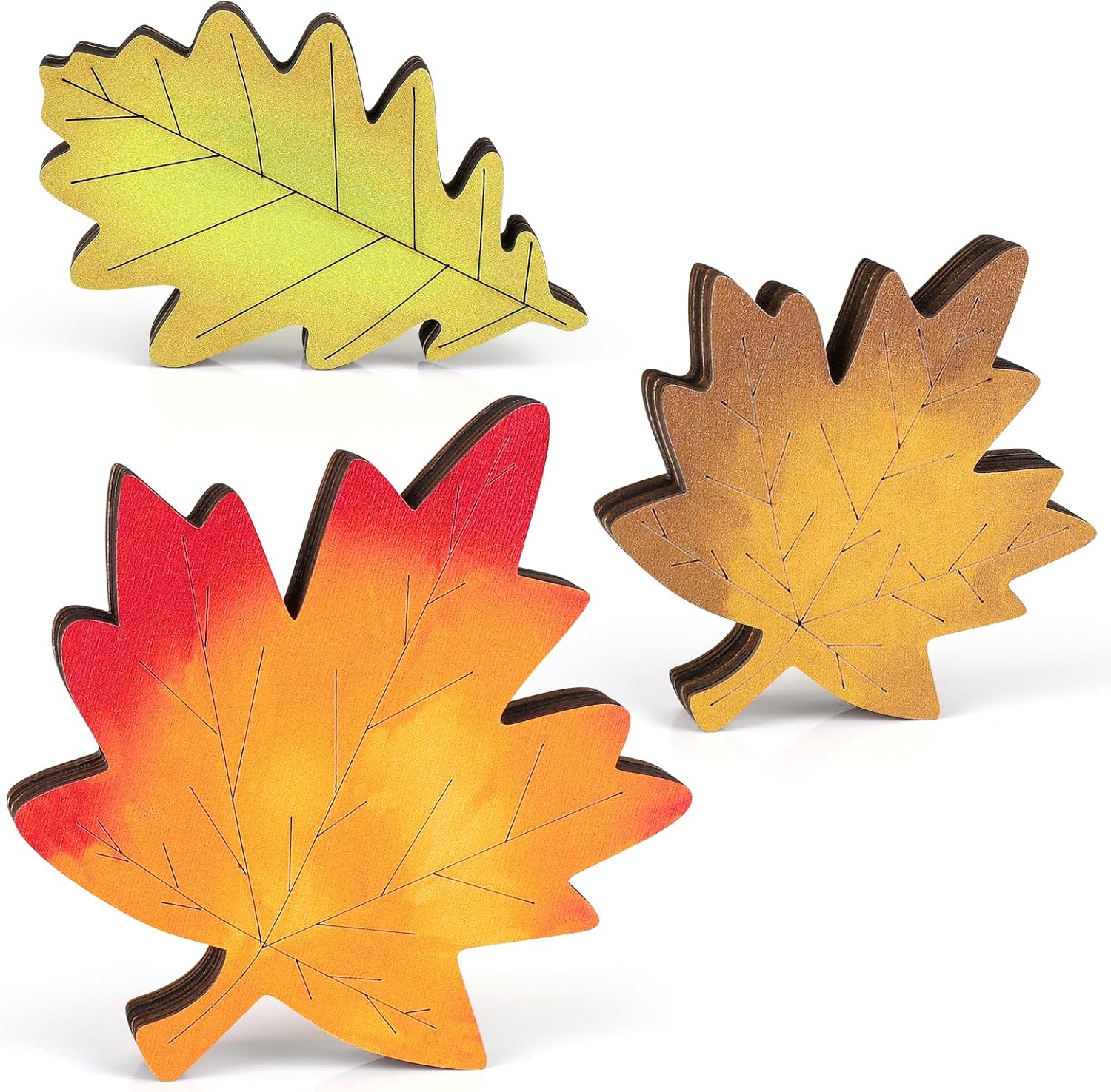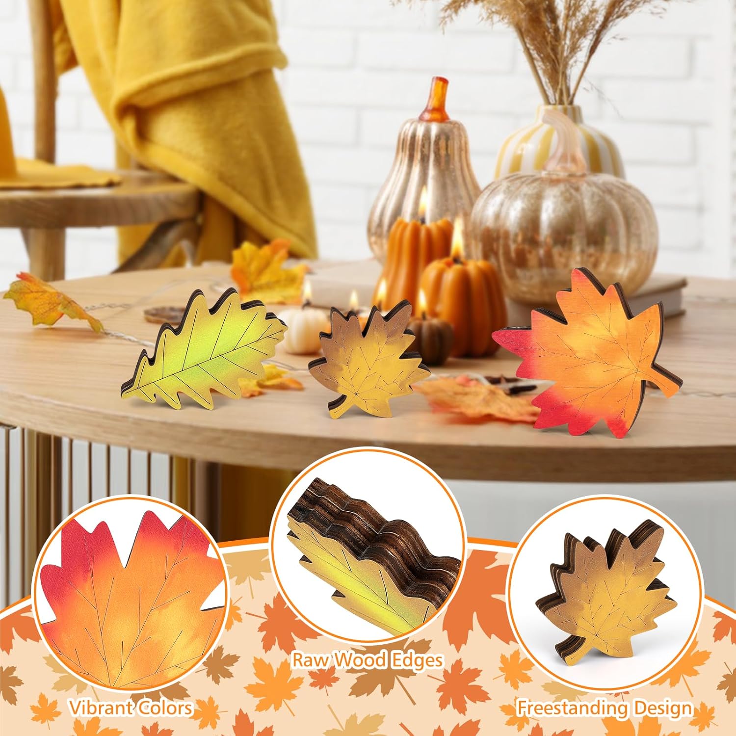- Unique Fall Design: This fall tabletop decor set includes 3 leaves in varying colors and sizes, each with double-sided designs. Offering versatile and charming options to enhance your seasonal display