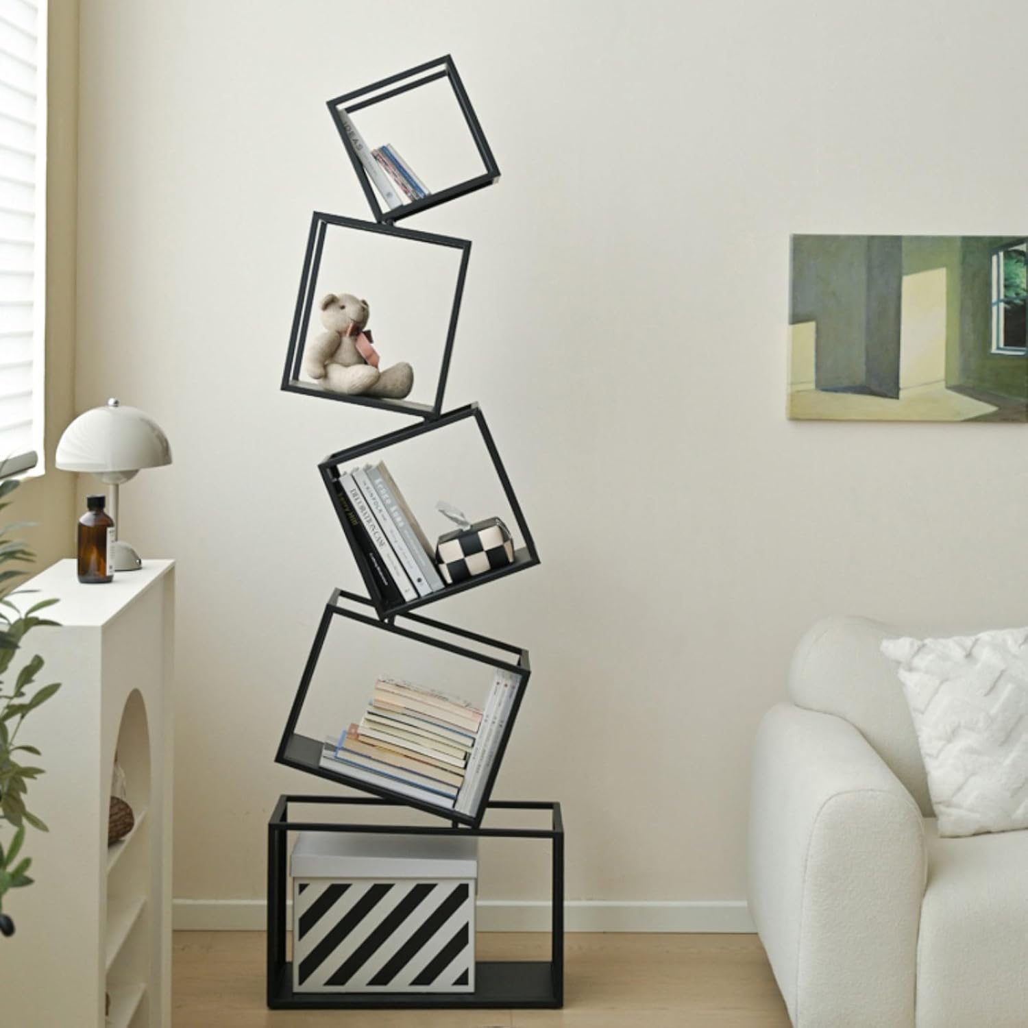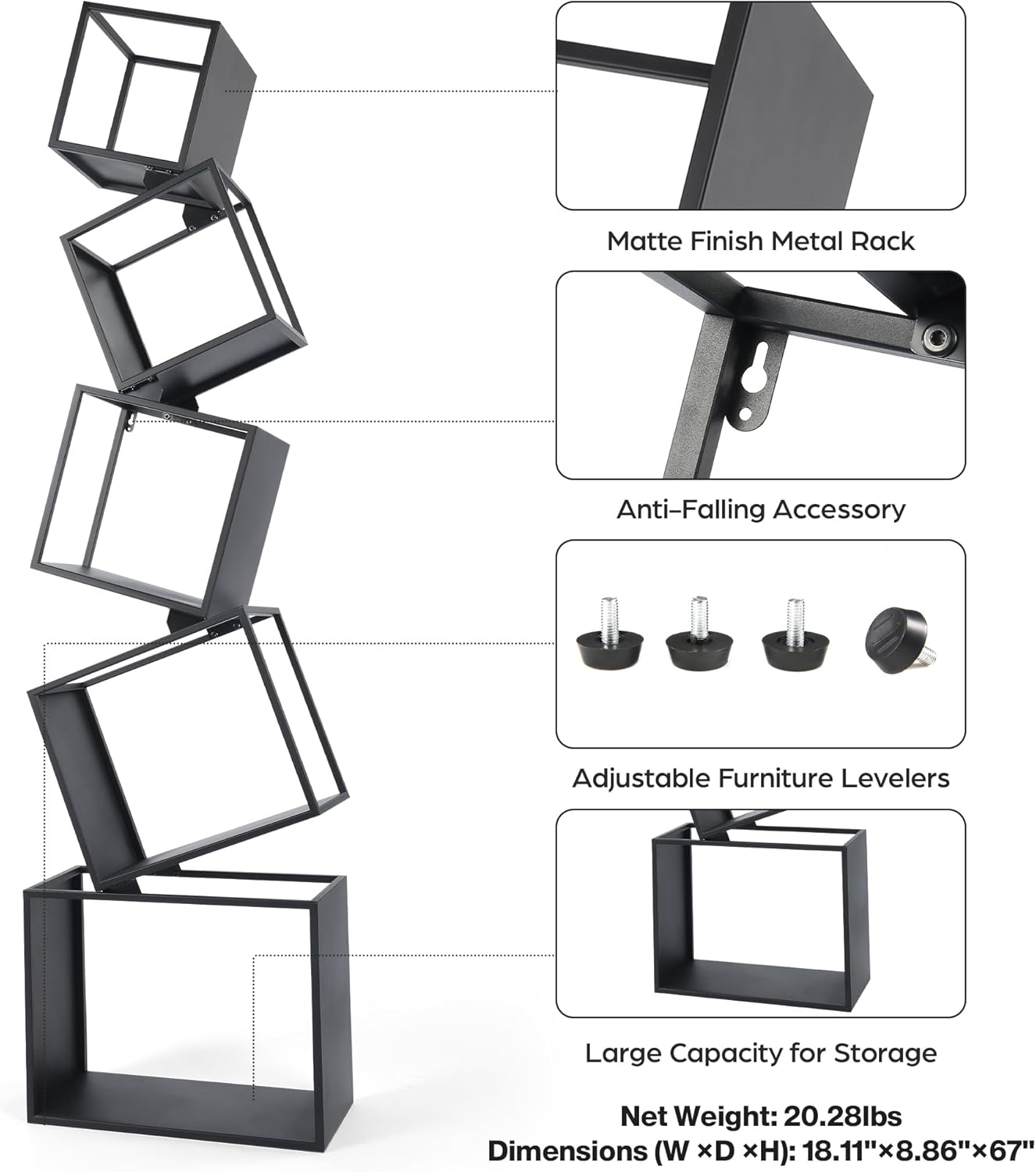 Unique Geometric Style: Featuring a playful, eye-catching geometric shape, this modern bookshelf adds a bold statement to any contemporary space. Its sleek black finish enhances any room’s decor. Dimensions: 18.11″ x 8.86″ x 67″.