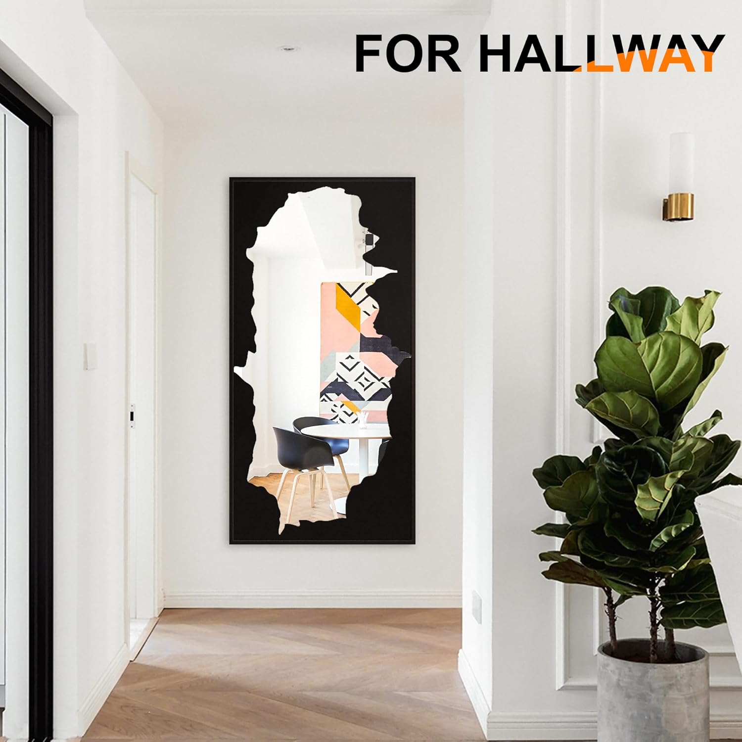 This 55″x28″ full-length mirror features a striking black abstract overlay, blending modern artistry with functionality. Whether used as a floor mirror or wall-mounted, the artistic design acts as a focal point in any room. The high-definition reflective surface provides crisp, clear, and accurate reflections, perfect for daily grooming and adding depth to your space. Constructed with explosion-proof membrane glass, this mirror ensures safety in homes with children or pets. Its versatile size fits seamlessly in various rooms, including bedrooms, bathrooms, and entryways. Easy to install with secure mounting hardware, it offers both stability and style in your home.