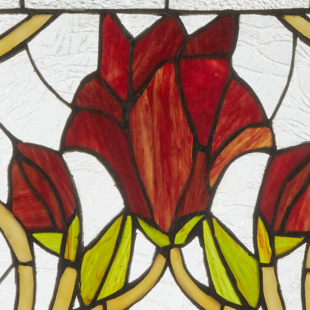 Tangled crimson vines and blooming florals are captured mid-movement in richly colored stained glass — like a garden frozen in time and light.