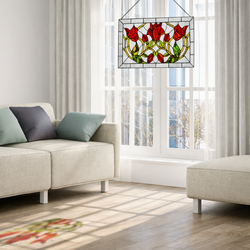 Each panel filters natural light into a wash of warm reds, greens, and golds, casting living color across any room it touches.