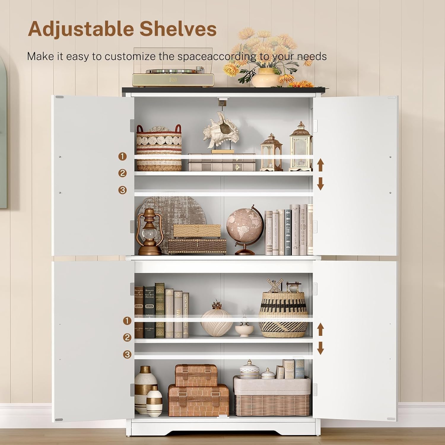 - ⭐【Ample Storage & Efficient Space Utilization】Storage cabinet interiors are thoughtfully designed with 2 adjustable shelves, offering ample storage space to accommodate all your life essentials and personal care items. Behind the 4 barn doors lie 4 tiers of hidden storage compartments, enabling effortless organization and maintaining a tidy and orderly for your room.