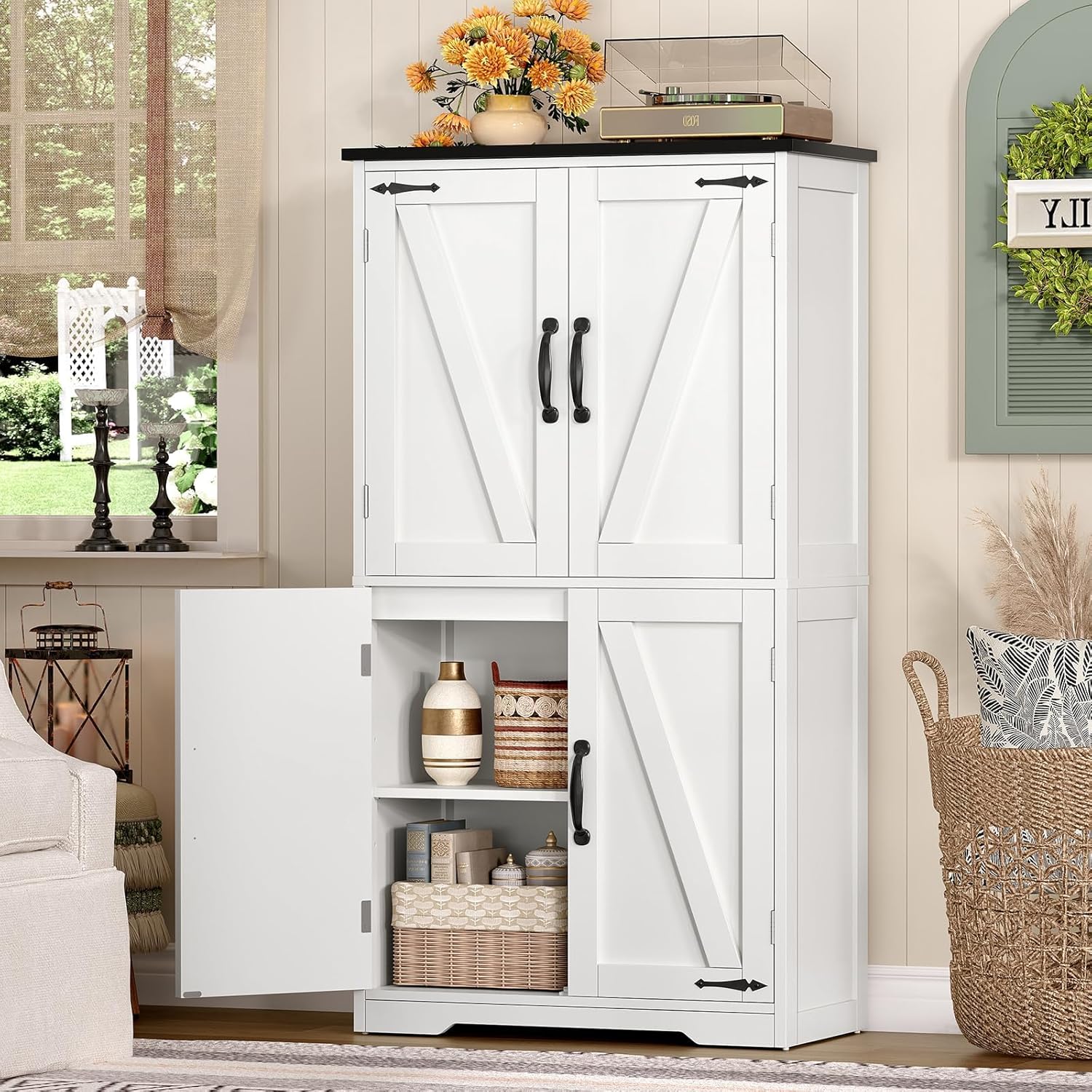 - ⭐【Elegant Design & Distinctive Charm】The farmhouse storage cabinet incorporates classic barn door design elements, adding a touch of vintage and rustic flair. The four barn doors serve as a page out of a countryside idyll, creating an inviting and serene atmosphere.