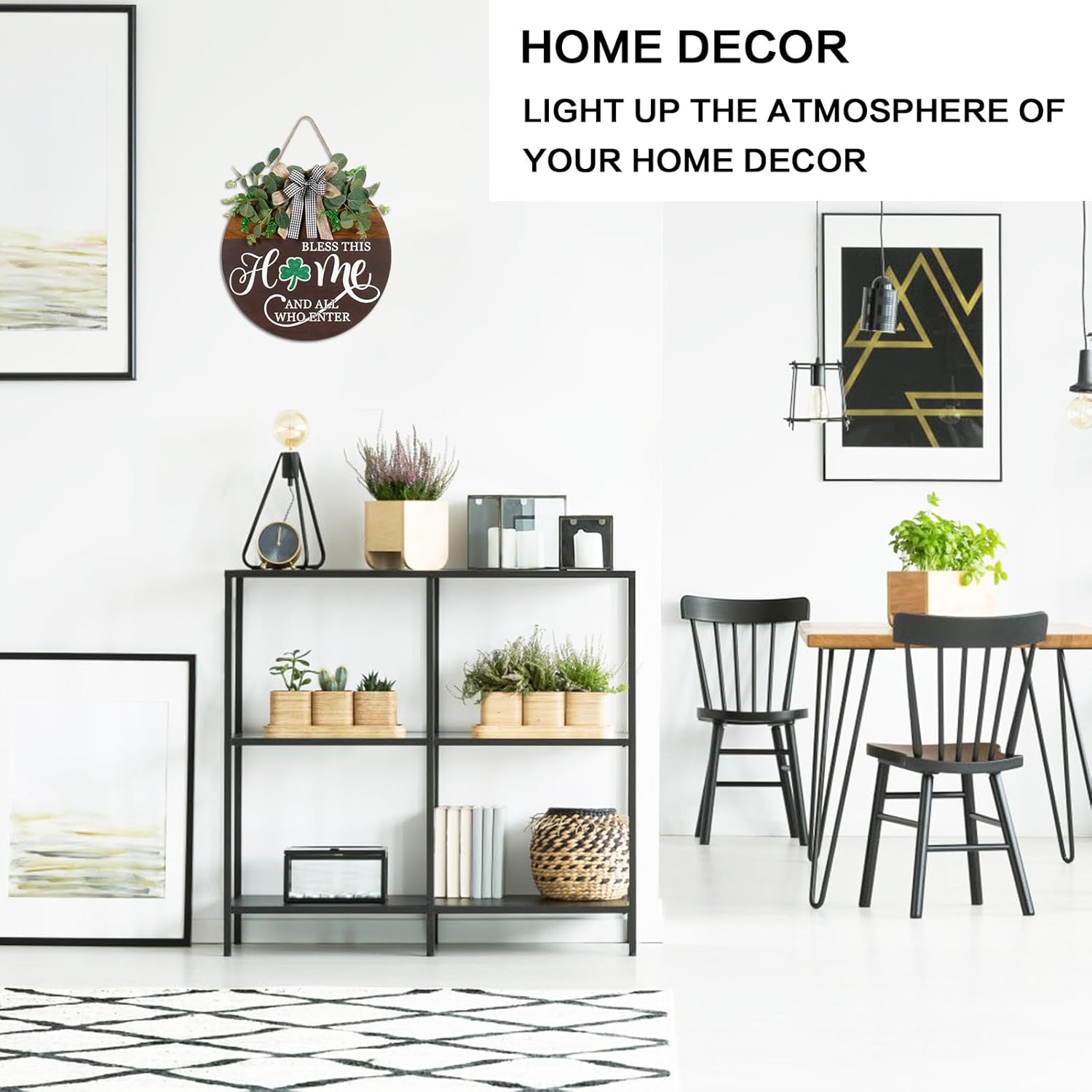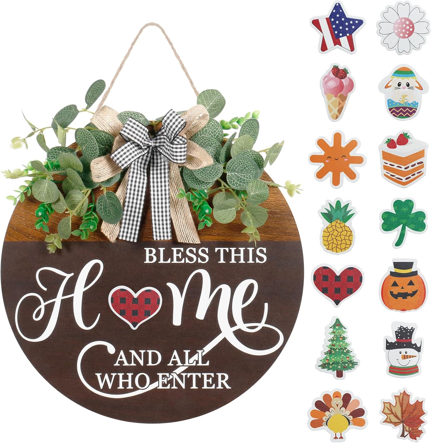 • HOME DECOR: Our front door welcome sign features a circular wooden board with the words “BLESS THIS HOME AND ALL WHO ENTER”, paired with green plants, two styles of bow, and 14 interchangeable signs. It not only ensures a charming appearance, but also embodies a way of hospitality – whether welcoming family, friends, or neighbors.