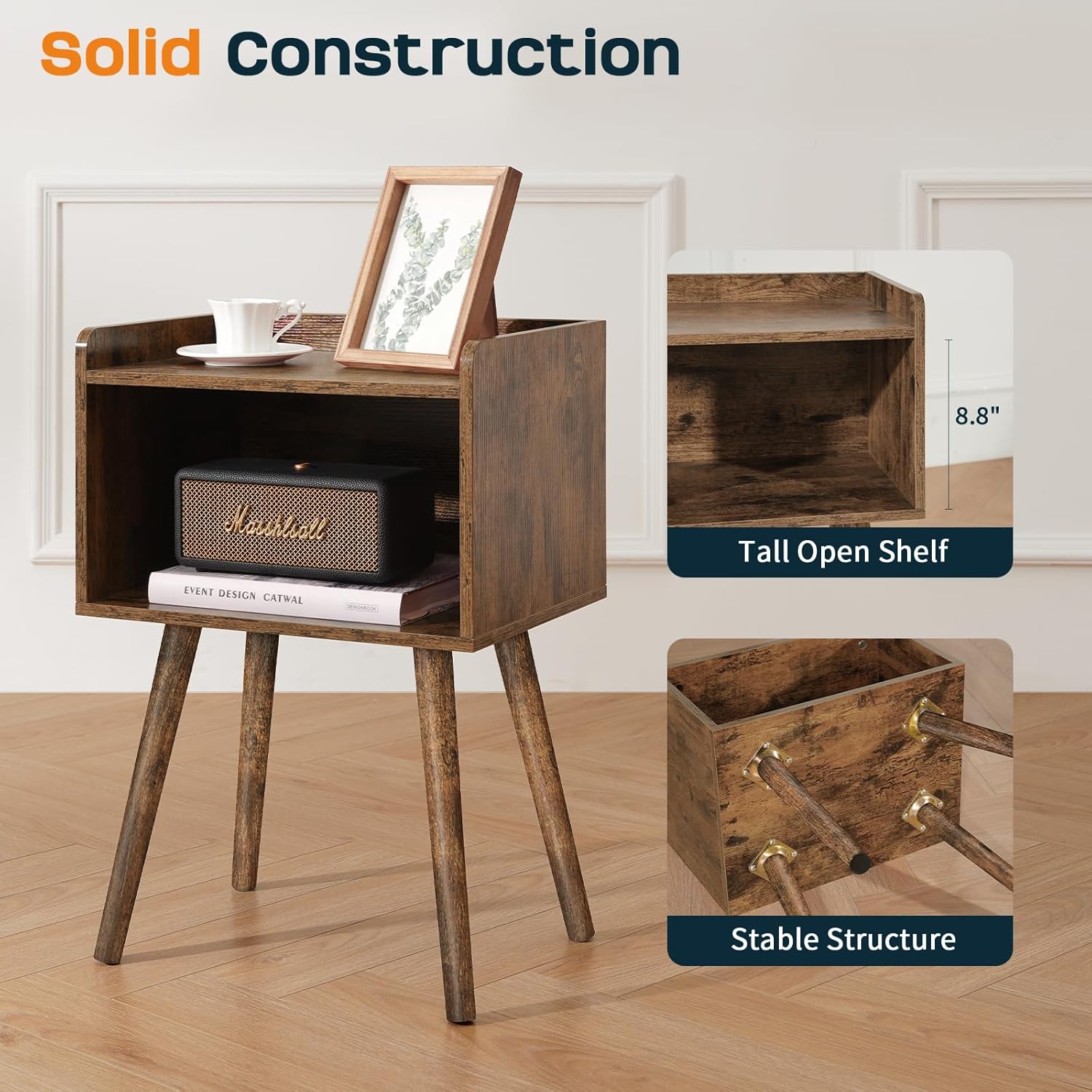 Durable Construction: Crafted from FSC-certified wood with sturdy splayed legs, this nightstand offers solid stability and long-lasting use, supporting up to 100 lbs. No wobbling, ensuring secure storage for lamps, books, or other items.