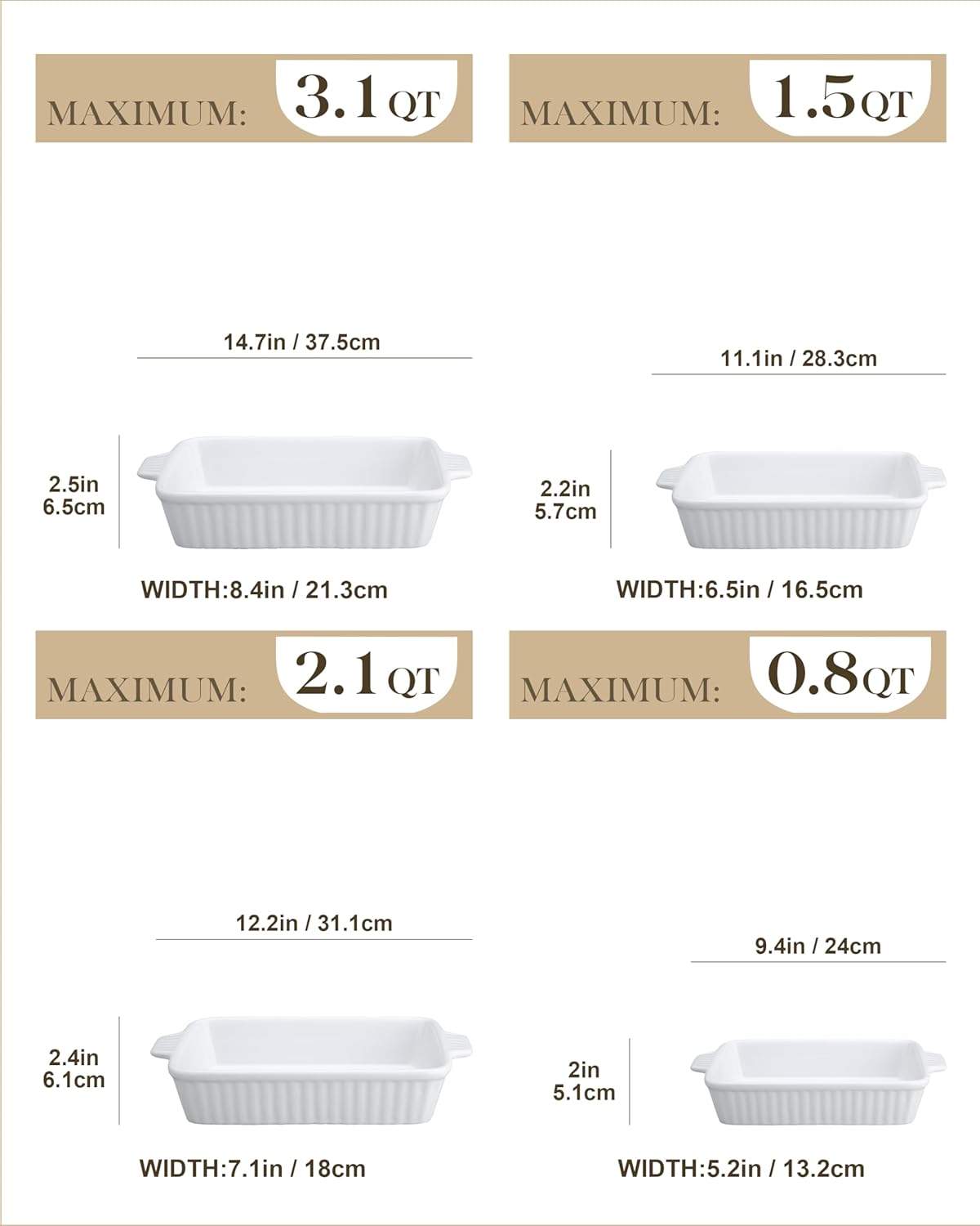 4 Size Options: Includes 0.8QT, 1.5QT, 2QT, and 3QT dishes for various cooking needs.