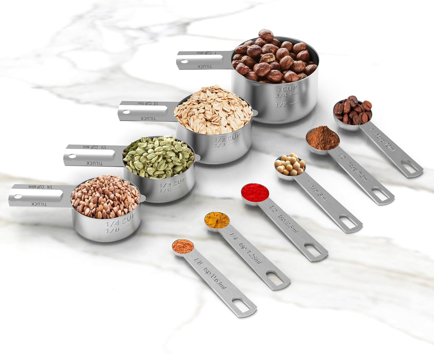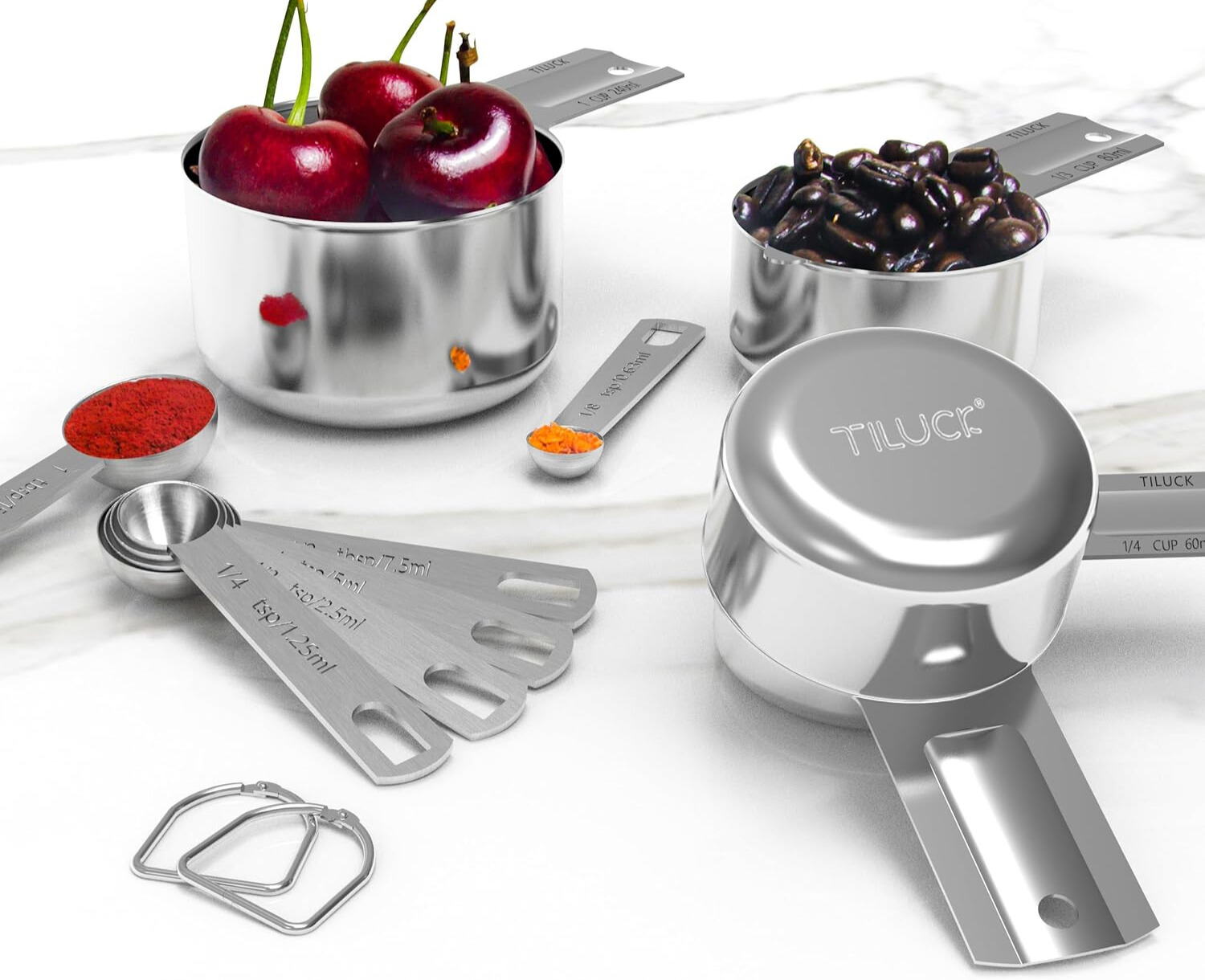 - [Premium Material]: The measuring cups made of Food-Grade 18/8 Stainless Steel. The measuring spoon made of premium Food-Grade Stainless Steel.100% rust-resistant, no toxic elements, which is safe to use for both dry and wet ingredients