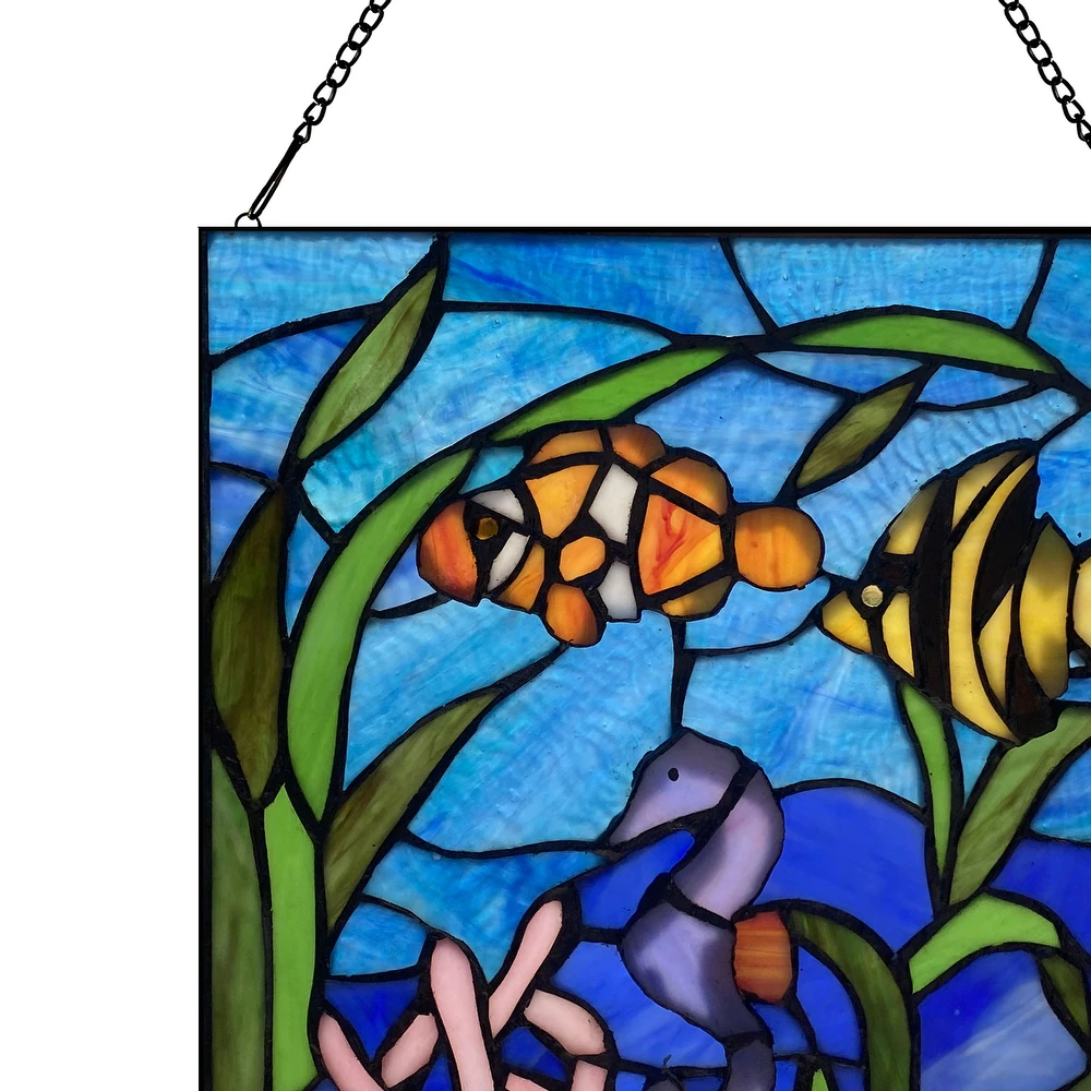 • Dive into an enchanting underwater world with this handcrafted stained glass panel, showcasing a vibrant array of tropical fish, coral, and sea life rendered in rich, multicolored glass.