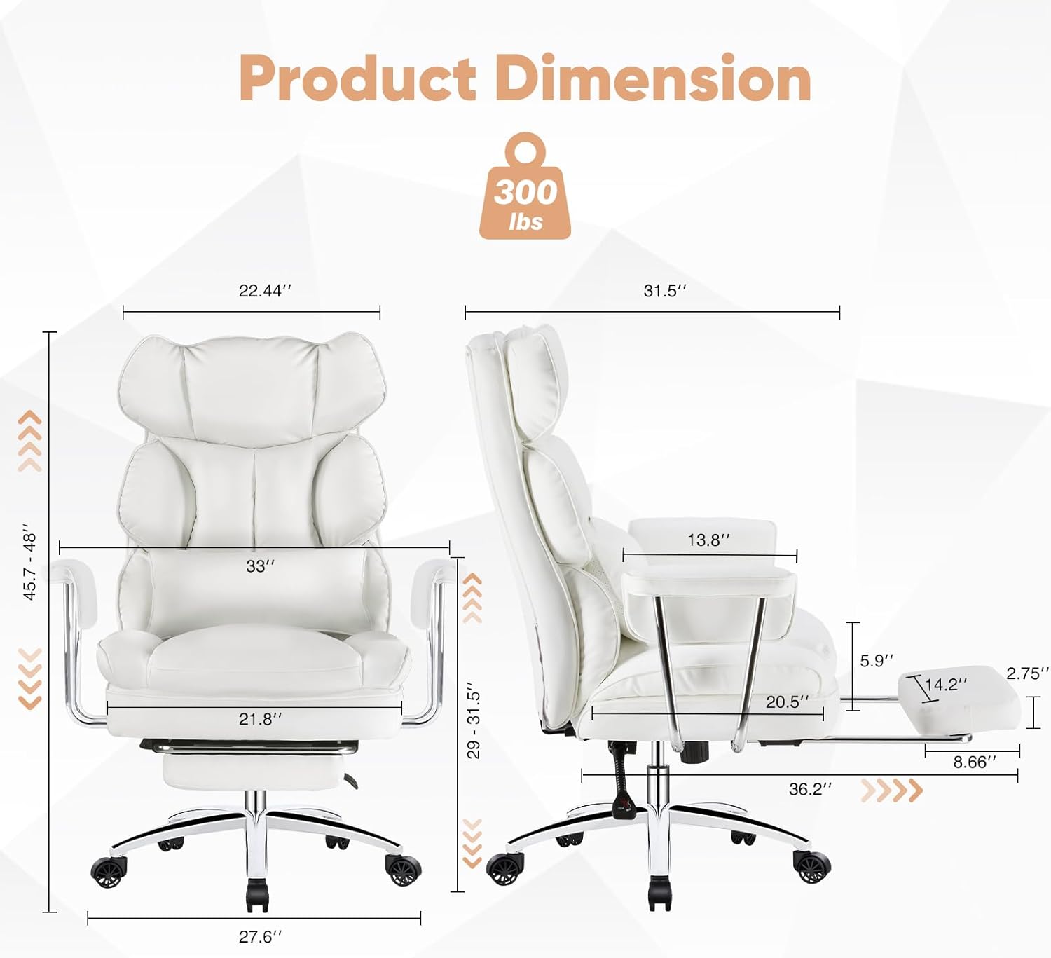 - 【DYNAMIC MULTI-FUNCTIONAL ADJUSTMENT】The desk chair has 360° free and smooth rotation, 3.2”in seat height adjustment, 135° tilt angle of back, adjustable lumbar support pillow, retractable leather footrest and height adjustable leather armrest. Customize your sitting posture, so that you can easily switch office and nap mode, make your work space more comfortable and relaxed, relieve your fatigue.
